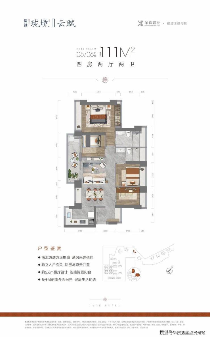 111㎡的4房2厅2卫,设计的是横厅南北通透格局,进门入户玄关,客餐厅5.6米开间,LDKB一体化设计,五开间朝南,客厅连接次卧出6.15米长的大阳台,U型厨房,卫生间干湿分离,得房率约75.4%(不含赠送),阳台主朝东南或西南向,其中西南朝向可以看阳台山景。