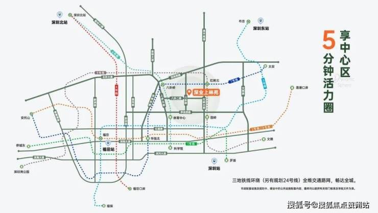 近享福田成熟交通配套,4地铁线环绕(地铁6、7、9号线,另有规划24号线),畅达全城。3口岸、5高铁站,多条城市主干道,全维交通路网,多方式通达全城与香港,打造湾区半小时生活圈,深港双城无缝衔接。