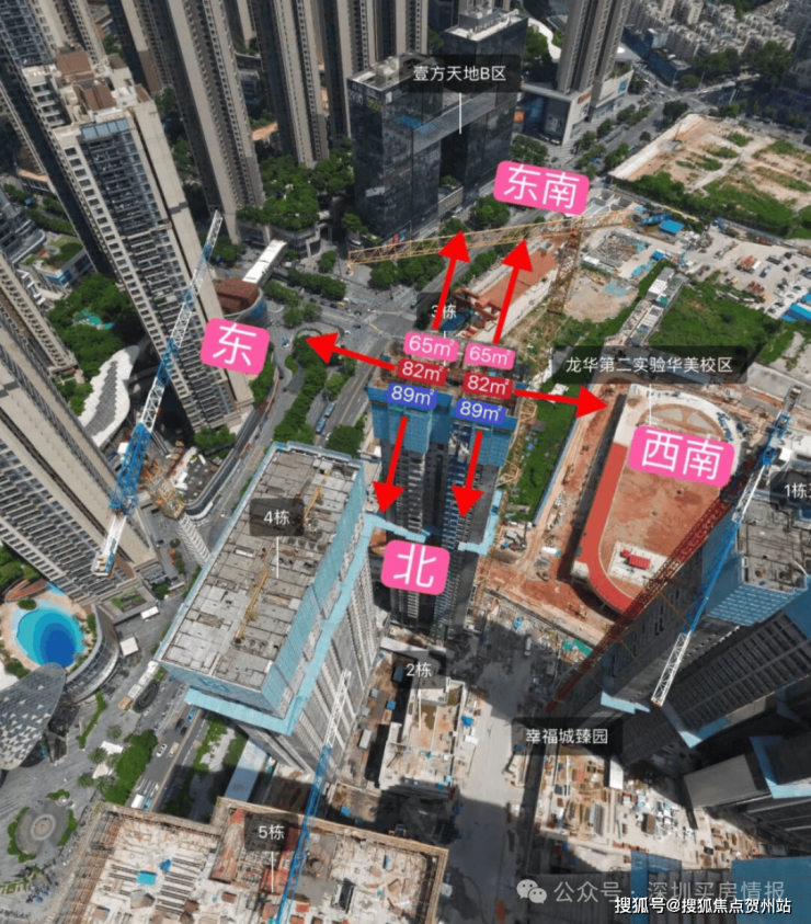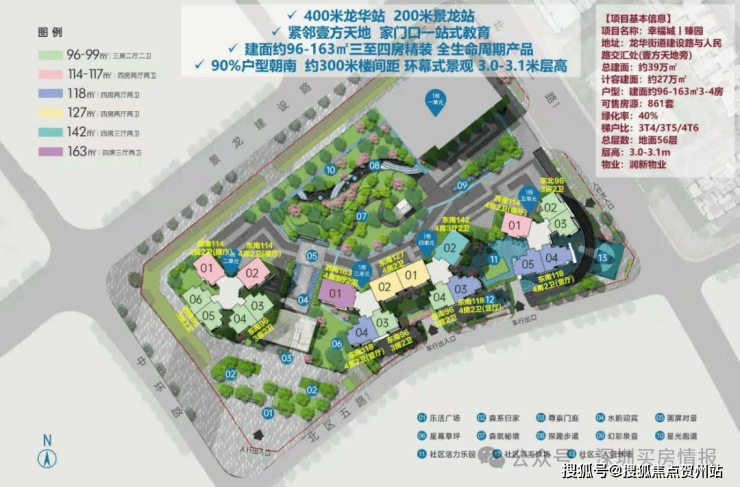 01-01地块占地约1.93万平方米,总建筑面积约23.8万平方米,容积率为8.81,绿化率为40.01%。该地块由1栋40层的办公单元和4栋56层的住宅单元,还规划有公交首末站。地块总规划980户,住宅单元设计为3梯4户、3梯5户和3梯6户,规划停车位1533个。