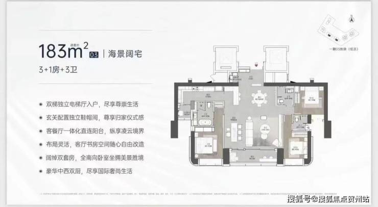 183㎡的4房2厅3卫,双梯独立电梯厅入户;西南向,