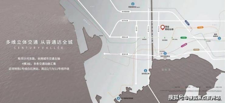 五轨四横三纵多枢纽:项目毗邻沙河东路,950米达深南大道;驾车1.5公里进入北环大道,坐拥城市交通主轴,与总部经济圈紧密相连,近邻地铁1号线白石洲站,1站到达高新园,周边五轨环绕,纵横湾区主场,从容通达世界。