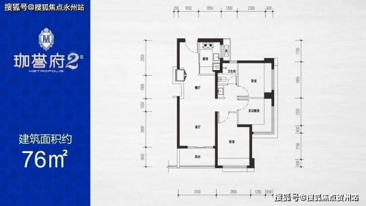 76㎡的3房2厅1卫:设计的是竖厅格局,LDKB一体化,客厅3.1米开间,S墙设计预留冰箱卡槽位,3个卧室分别为2.9/2.8/2.25米的宽度,U型厨房,阳台进深1.6米,东南朝向。
