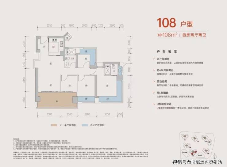 108㎡四房两卫:四开间朝南,配备约6米阔景阳台,主卧带270°L型飘窗,得房率超106%,空间尺度感强,适合三代同堂家庭。