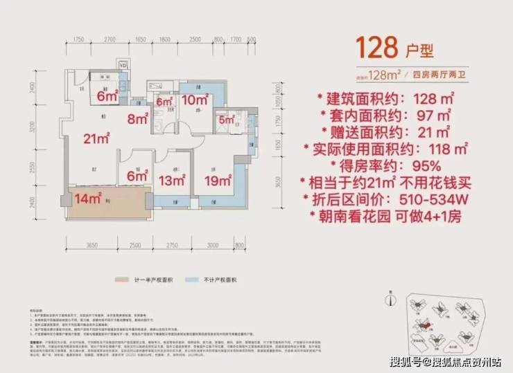 128㎡四房两卫:作为楼王户型,采用南北双阳台和LDKB一体化设计,赠送面积最高达21㎡,主卧套房面积约20㎡,居住舒适度最高。