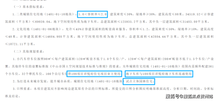 1.小汽车停车位按照90㎡≤每户建筑面积<120㎡配套不低于1.0个车位/户,120㎡≤每户建筑面积<200㎡配套不低于1.5个车位/户设置,其他停车位的设置标准按《中山市国土空间规划技术标准与准则》的要求。另外城镇住宅用地(1401-01-10地块)范围内需额外配建361个小车位、32个摩托车位、166个自行车位供108项目君悦府住宅项目业主使用。地下车库与108项目君悦府地下车库连通使用。