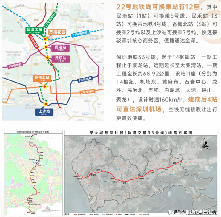 项目距地铁口仅约200米,乘坐地铁22号线(在建中,预计2028年通车)南行,5站到福田,9站直达福田上沙站,还可便捷换乘5号线、4号线、2号线、7号线,北行直抵东莞;乘坐地铁33号线(在建中,预计2026年通车)4站可直达深圳机场