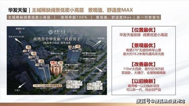华发新一代好房子,南湾首个新规四化宅,户户实得率超100%;360°采光楼型,栋栋视野无遮挡,南望将军山,幕墙全景阳台;定制推拉门窗,灵活开合拓宽空间