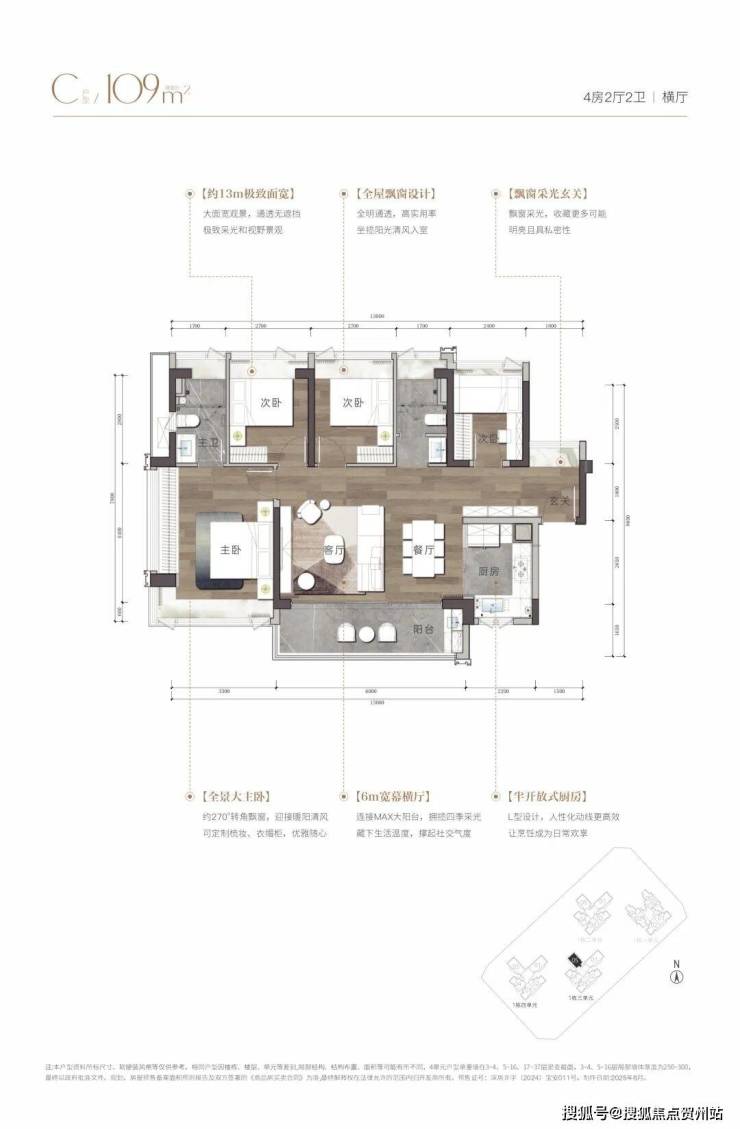 建面约109㎡的户型:横厅设计,三面采光,大阳台,整体上通透性、观景体验更好,空间实用率更是高达96%!