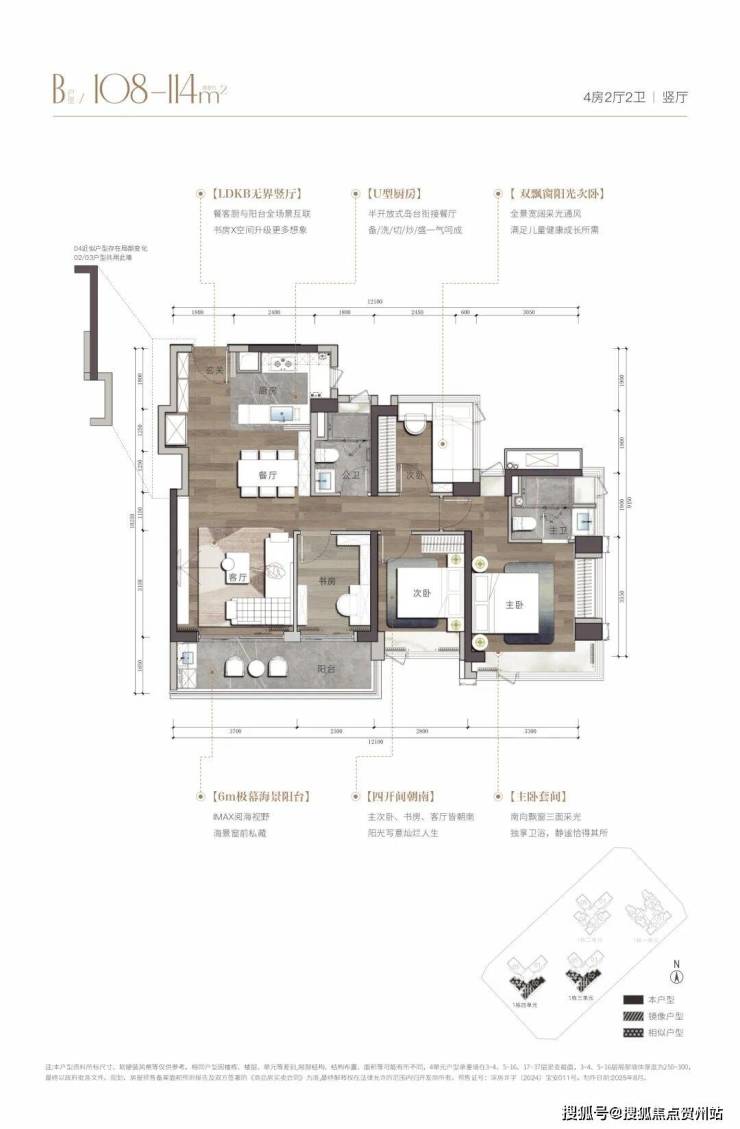 比如建面约108㎡-114㎡的B户型:采用经典的竖厅设计,客厅与相邻的次卧可以打通,业主可以根据自己的喜好和需求进行打造,相当于伴随着家庭的不同阶段扩展出不同功能。