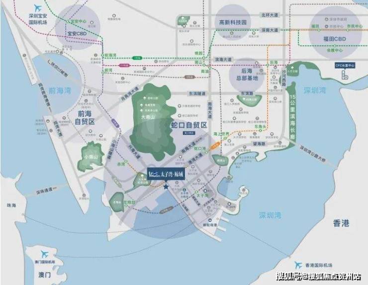 轨:地铁2号线(蛇口港站660米)、地铁5号线(赤湾站)、地铁12号线(太子湾站),轨道交通便利。