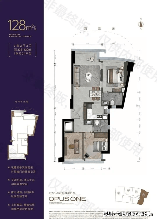· 128-135㎡三房两厅两卫:舒适海景户型,单边位设计,折后总价 420-630 万,单价 32000-45000 元 /㎡。