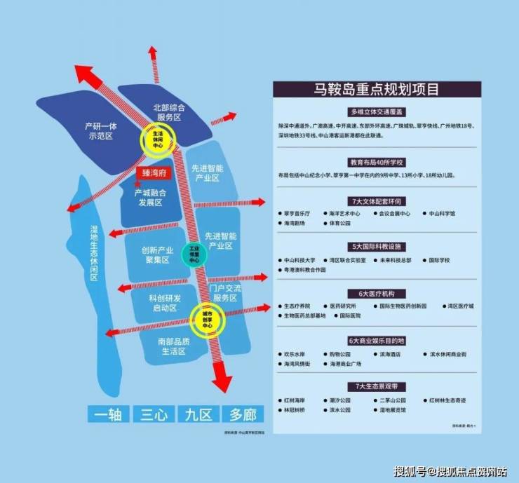 为了更好承接来自深圳的产业外溢、人口流入,马鞍岛高起点规划了“一轴、三心、九区、多廊”的发展布局,40所学校、13大城市公园等72大重量级顶配,意在打造集智造产业、科技金融、健康医疗、生态居住功能为一体的智创滨海新城。