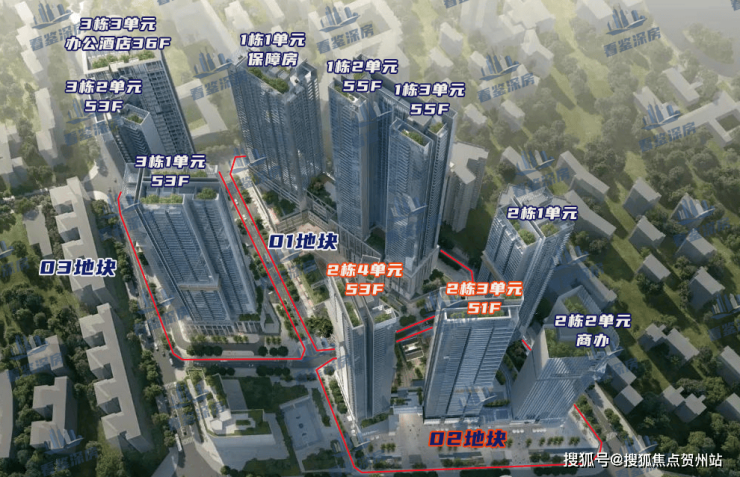 规划为3栋超高层塔楼住宅+幼儿园,1栋一、二单元193米55层,1栋三单元为保障房157米44层。