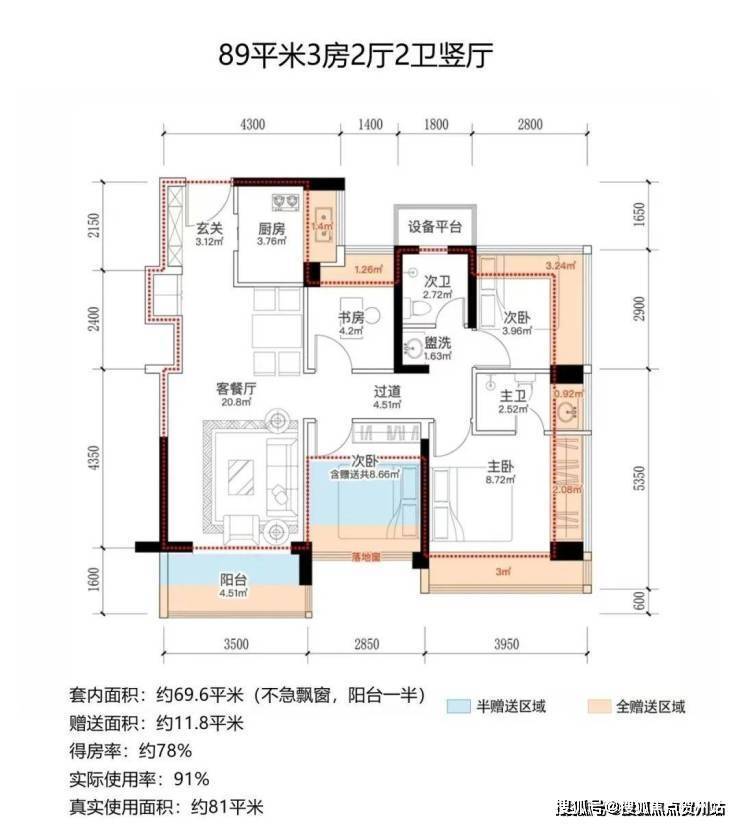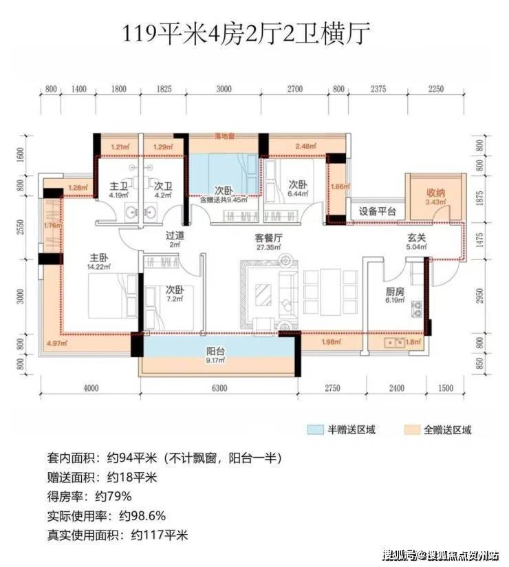 设计的是横厅南北通透格局,进门入户玄关,客餐厅6.35米开间,4个卧室分别做到了4米/3.5米/3米/2.7米的宽度,主卧+1个次卧270°飘窗,另有1个收纳间,客厅连接次卧出6.3米长大阳台,L型厨房,得房率约98.6%(包含赠送),阳台主朝西南或东南向。