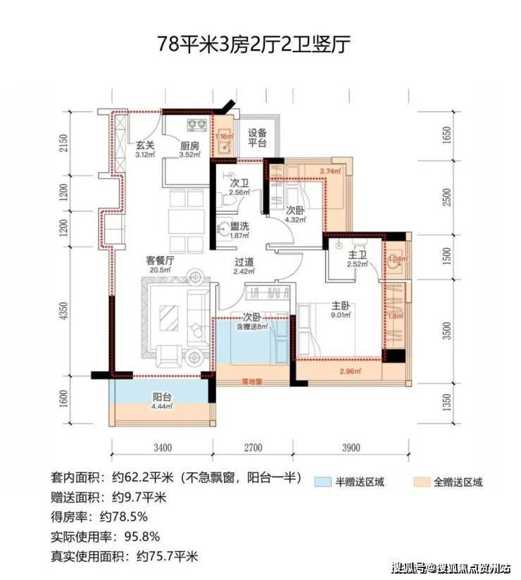 设计的是经典竖厅格局,进门入户玄关,客厅3.4米开间,动静分区,三开间朝南,3个卧室分别做到了3.9米/2.7米/2.5米的宽度,主卧+1个次卧270°飘窗,U型厨房,卫生间三段式分离,得房率约95.8%(包含赠送),西南或东南朝向。