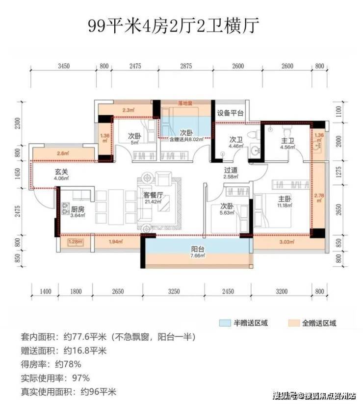设计的是横厅南北通透格局,进门入户玄关,客餐厅5.9米开间,4个卧室分别做到了4米/3.1米/2.875米/2.45米的宽度,主卧+1个次卧270°飘窗,客厅连接次卧出5.7米长大阳台,U型厨房,得房率约97%(包含赠送),阳台主朝西南或东南向。