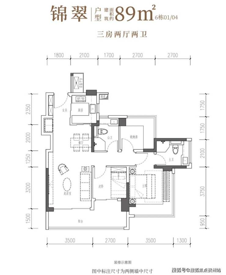 建面约89㎡3房2卫