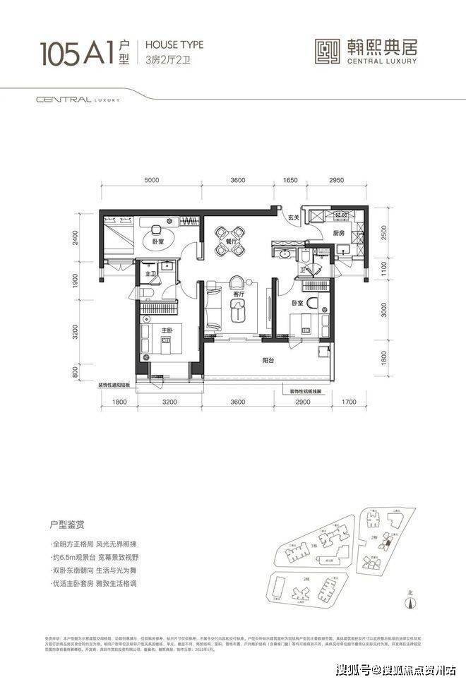 (1)105㎡3房2卫:双龙抱珠格局,朝东/南,阳台开间6.5米,适合刚需家庭。