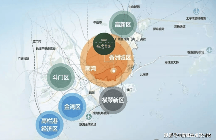 ▫南湾位居珠海地理几何中心,东面一桥之隔即为香洲老城区,南面与横琴粤澳深度合作区、十字门中央商务区一山之隔;西面规划鹤州新中心;