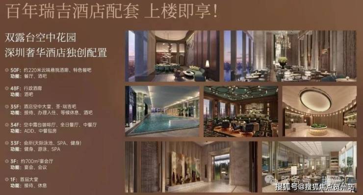 瑞吉酒店位于项目33-50层,系深圳西部首家瑞吉酒店。作为高奢酒店,瑞吉秉承绝对私人的服务标准。提供289间客房,设置云端悬挑酒廊(深圳首个天际悬挑酒廊)、天际泳池、空中露台咖啡厅、约790㎡宴会厅等高规格配套。