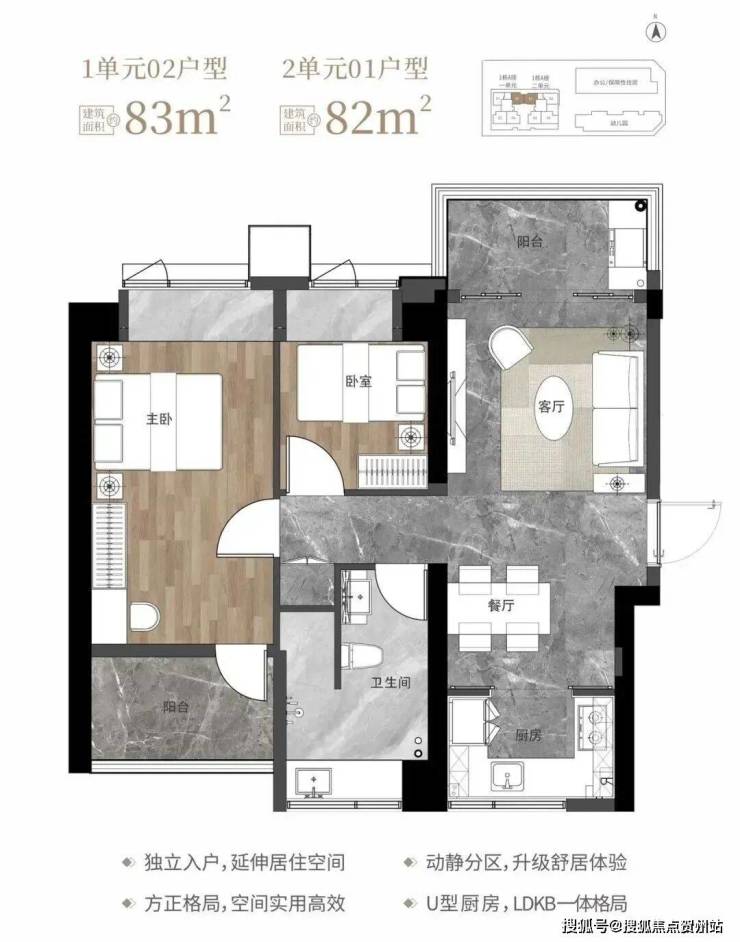 82-83㎡的3房2厅1卫,1栋1单元02户型/1栋2单元01户型,设计的是竖厅南北通透格局,独立入户,客厅3.2米开间,LDKB一体化设计,动静分区,南北双阳台,U型厨房,卫生间干湿分离,阳台正北朝向。