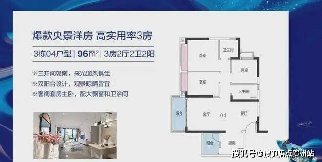 建筑面积约95㎡的舒适三房,双阳台设计,一边用于晾晒,一边用于观景,实用性满分。