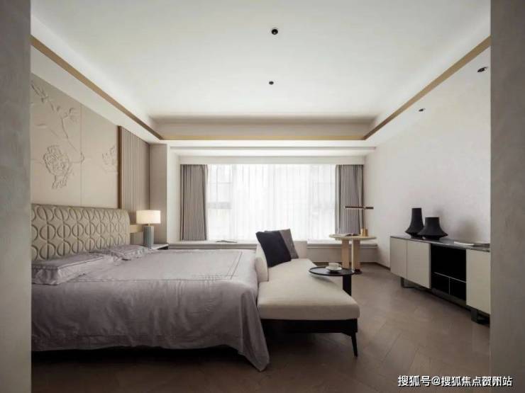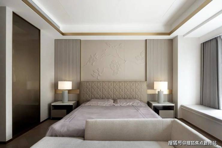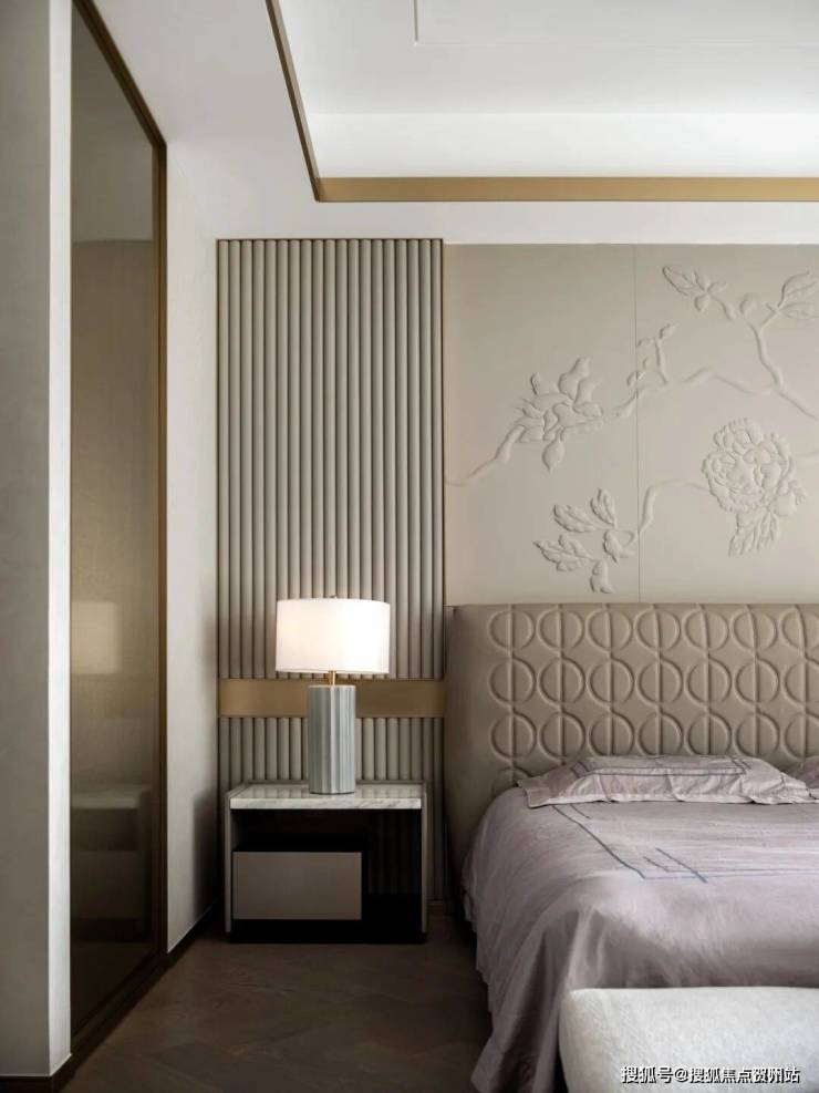浅米色墙面犹如轻柔蚕茧,床头立体雕花仿若绽放在素帛上的花景,满含东方韵味,与金属线条勾勒的天花板相互映衬,尽显精致与端庄。