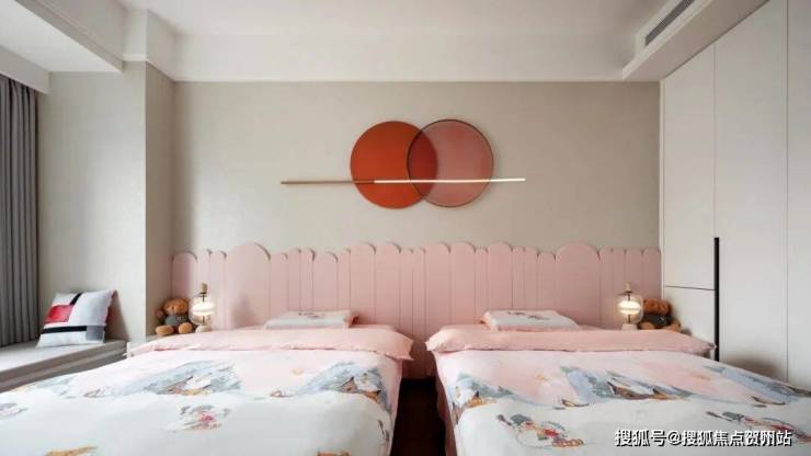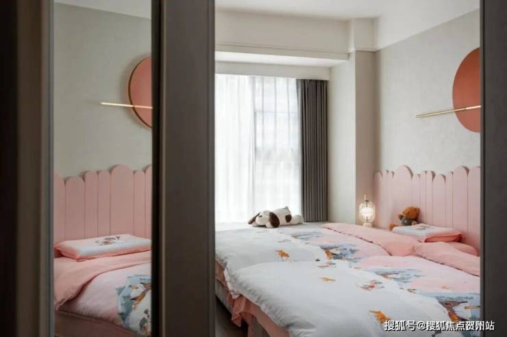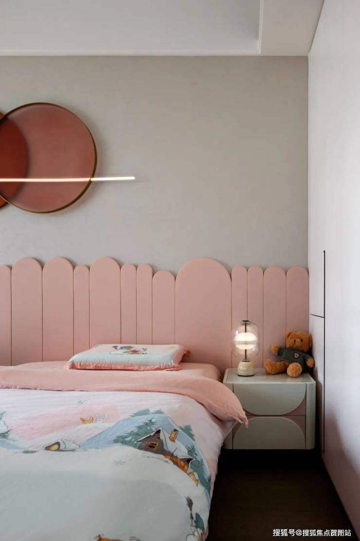 墙面以浅灰色打底,宛如轻柔云朵,为空间营造宁静氛围。床头那排粉嘟嘟的“花瓣”,好似童话中的魔法护盾,守护着甜美的梦境;上方圆形装饰仿若两颗小太阳,金属线条牵出暖光,照亮童年的奇妙幻想。