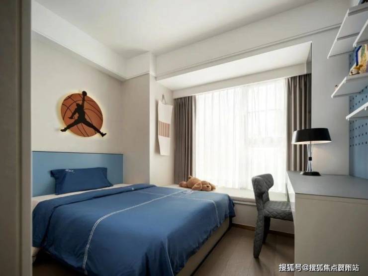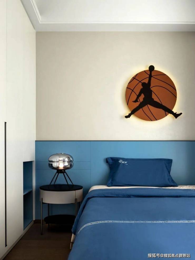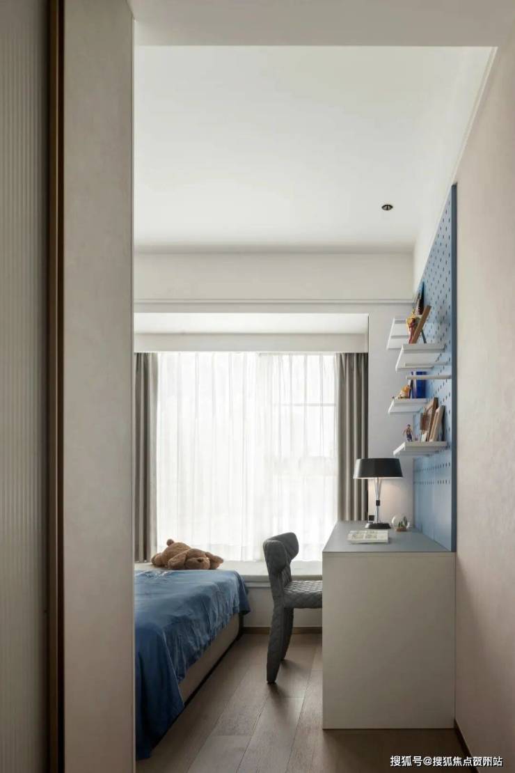 蓝色床品仿若静谧海洋,温柔拥裹着睡眠。床头板的蓝色与床品相呼应,打造出统一且舒适的别墅装修休憩区域。窗边的小熊、桌上的小物件,暗藏着童真的柔软,让活力与温情在此交汇融合。