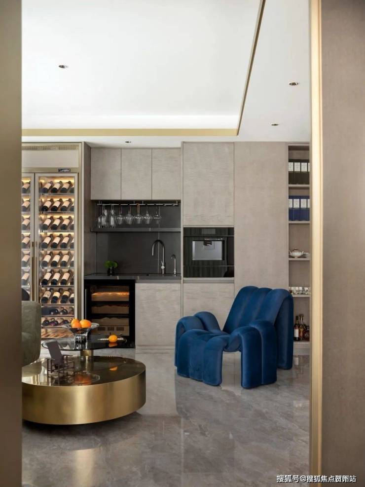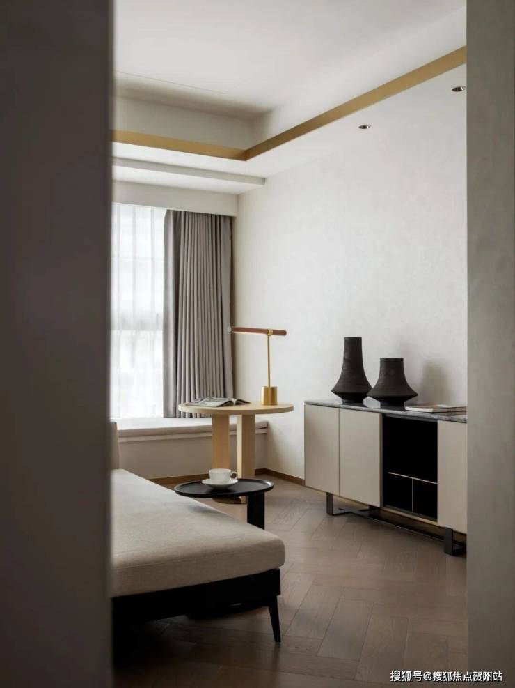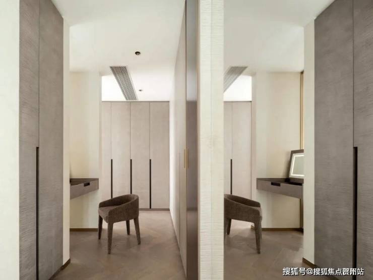 走进衣帽间,浅色调柜体似温柔容器,收纳生活诗意。卫浴间内,大理石的冷感与金色的暖意交织。玻璃隔断后,浴缸正对着城市天际,泡澡时可观云卷云舒,令身心于这方天地,与自然和精致一同沉醉。