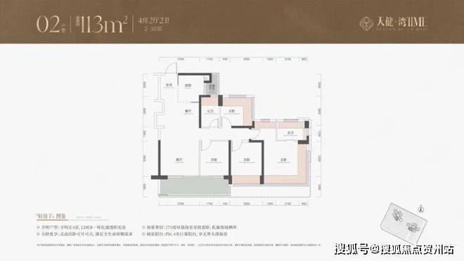 113平4房主力户型,大部分房源的采光和景观视野较好。