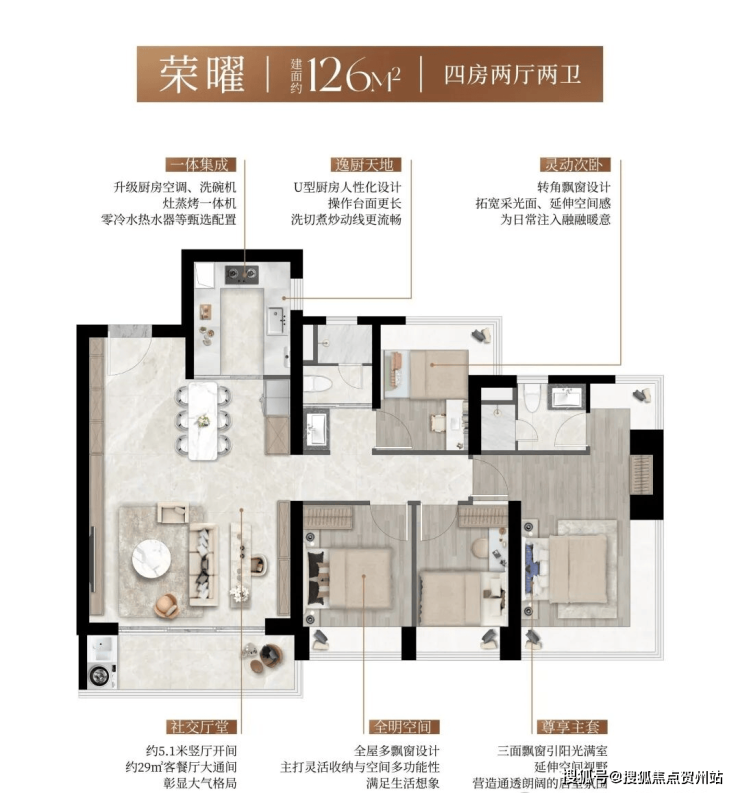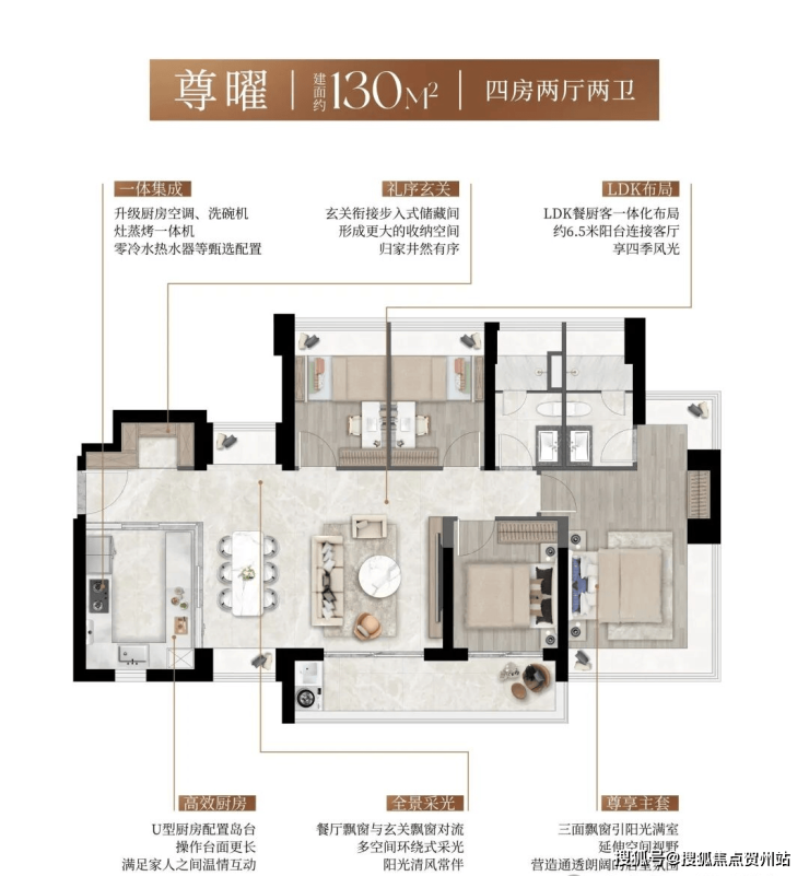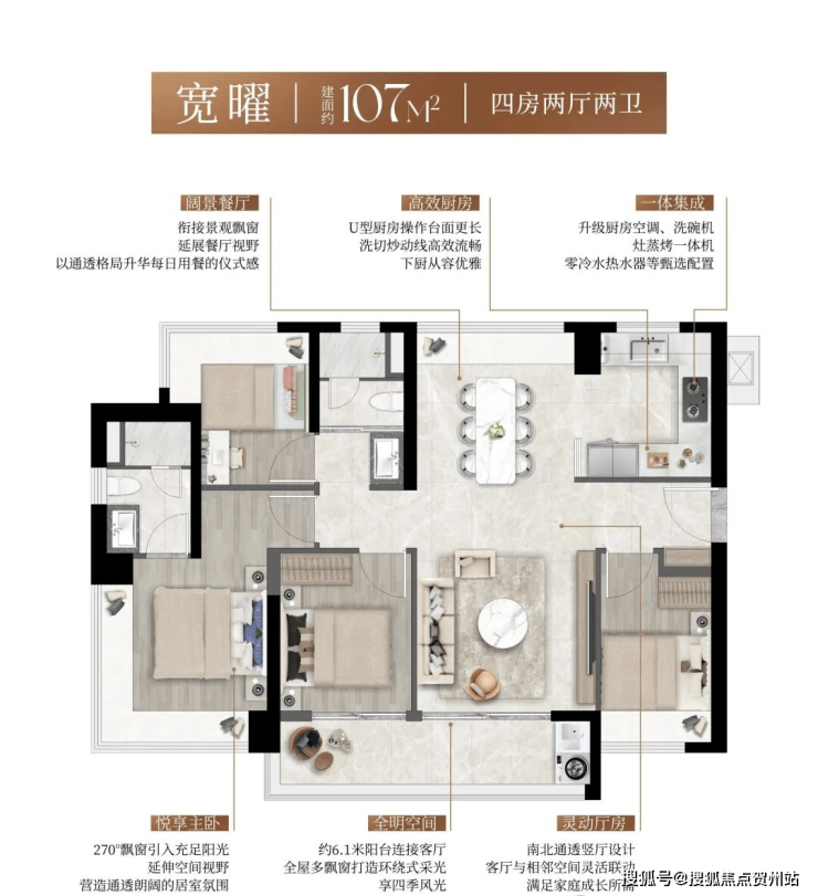 产品:3 栋住宅,总高 45–48 层,3 梯 5 户,精装交付;主力户型 93㎡三房两卫、103–107㎡四房两卫、130㎡四房两卫,全南向设计,新规户型得房率约 90%,空间利用率高。