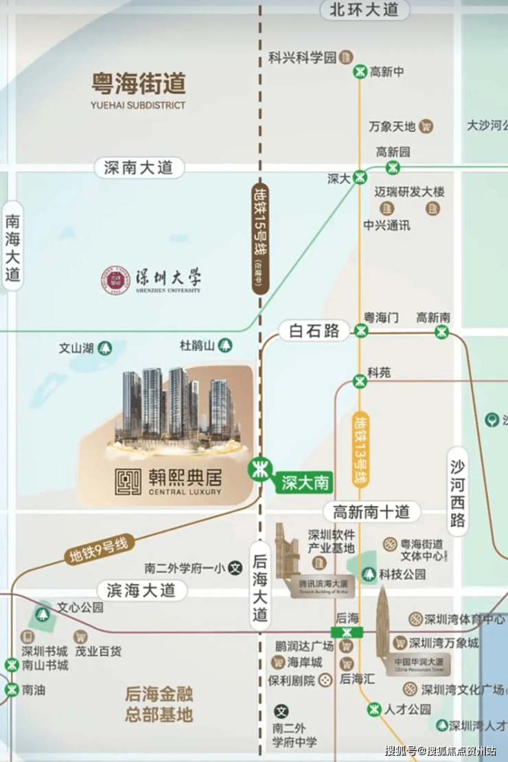 轨道交通:项目为地铁上盖 TOD 物业,无缝连接 9 号线和在建中的 15 号线深大南站,2 站可达高新园,3 站到超总湾,4 站达前海区域。