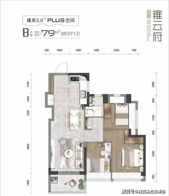 79㎡的3房2厅1卫,设计的是竖厅格局,客餐厅一体化,客厅3.2米开间,S墙设计预留冰箱位,3个卧室分别是3/2.4/2.3米的宽度,L型厨房,卫生间三段式分离设计,,西南或东南朝向。