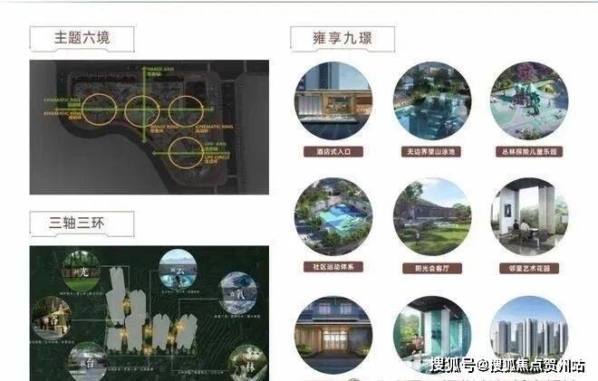 景观园林以“借山还山,师法自然”为设计理念,以“三轴三环”为结构,以”六境九璟“为核心景观主题,打造约2万㎡全龄乐活生态公园。