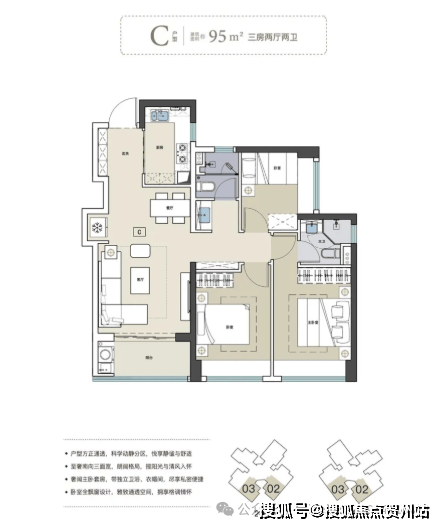 95㎡三房两卫户型:与75㎡户型设计理念相似,拥有开阔灵活的LDKB餐客厅,两个卧室与阳台同侧,均为南向,采光充足。