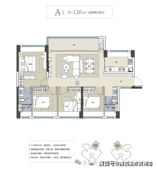 120㎡四房两卫户型:采用横厅设计,拥有一个11.4米的超大阳台,观景视野辽阔,且去除了竖厅必备的走廊,空间利用率更高。
