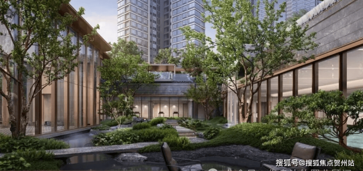 ③度假感下沉庭院:东方园林山水造诣,层级叠错。自然地形结合叠水叠石,形成特色森系庭院.