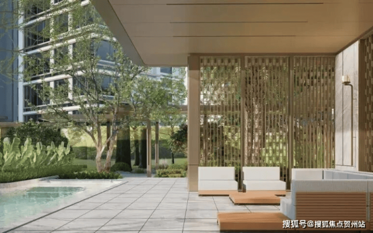 ②仪式感泗水归堂:镜面水庭设计,精选乔木铁冬青(旺宅的寓意)和镜面的水面结合,运用中国东方格局对称美学,借鉴皇家庭院的环抱对称,承载着‘聚水生财’的美好寓意.