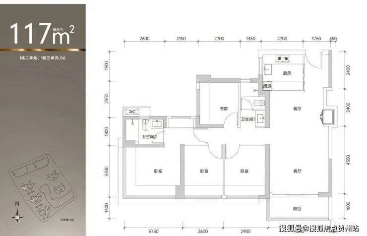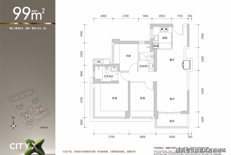 建筑面积约99㎡的3房2卫02/03/05/06户型:全南向爆款空间