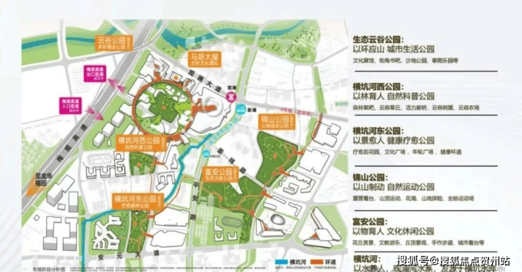 建设范围内包含5所幼儿园和3所九年一贯制学校、约40万㎡壹方天地商业、医疗卫生用地、社会福利用地、5大城市公园。