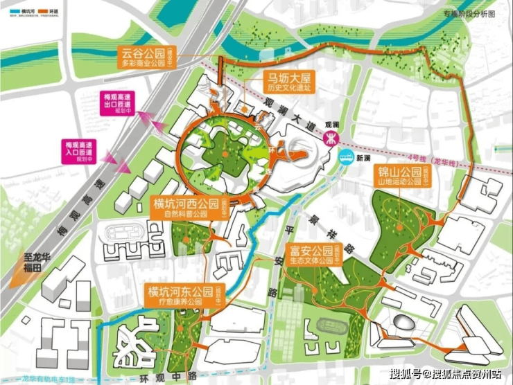 于外,不仅是 4 号线观澜站直连物业,观城还真金白银打造了与“前海地下路网”同级别的市级规划路网系统, 首创梅观高速直通小区,经由地下环道畅连各地块车库, 搭配整体「空中 + 地上 + 地下」的三重立体交通,实现业主的 高效出行 。