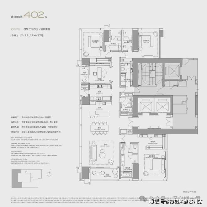 南北通透三面采光,顶奢总统套房规格,270°全景套房,享受湿地/公园/CBD景观,都是套房设计,更具私密性,中西厨分离。