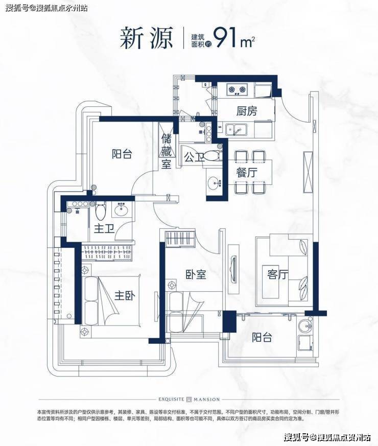 91㎡三房:竖厅设计,LDKB一体化布局,三开间朝南,主卧配备转角飘窗,U型厨房与干湿分离公卫,得房率89%。