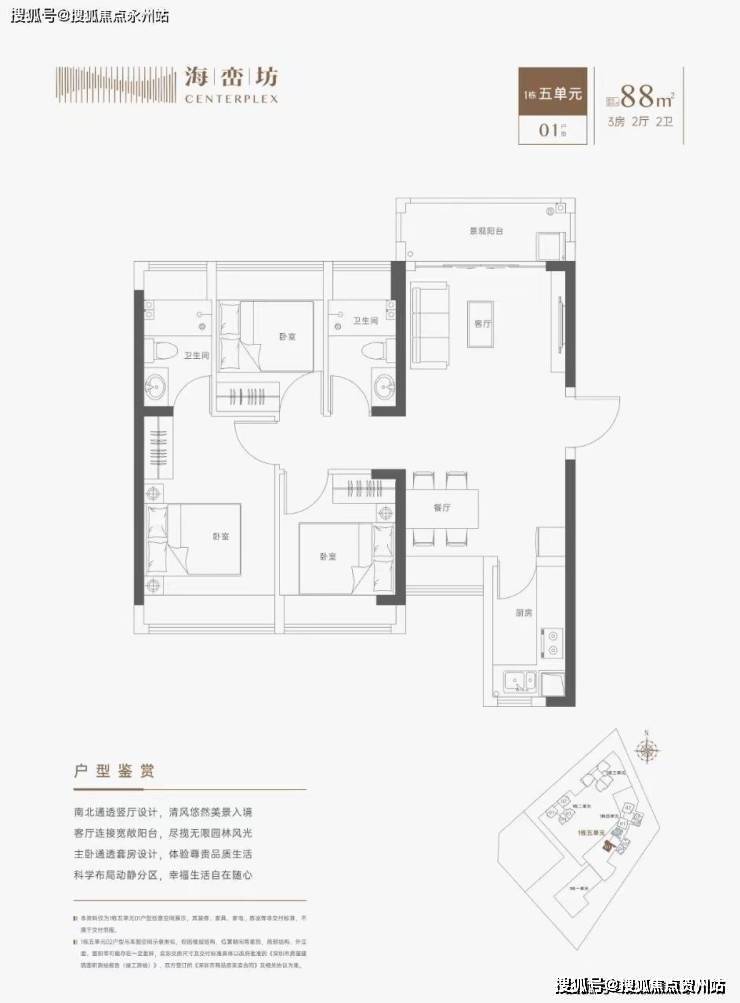 88㎡的3房2厅2卫(1栋2单元01户型),设计的是横厅南北通透格局,进门独立玄关,全屋飘窗,三开间朝南,U型厨房,得房率:73.88%(不含赠送),阳台主朝东南向。