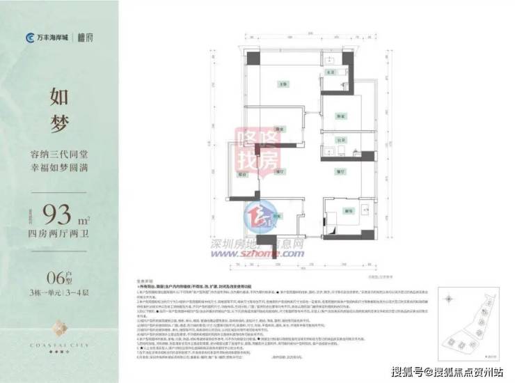 建面约93㎡户型,位于3栋一单元06户,整体仅40余套,是片区稀缺的入门级四房,以可控的总价预算,实现了四房的功能布局。