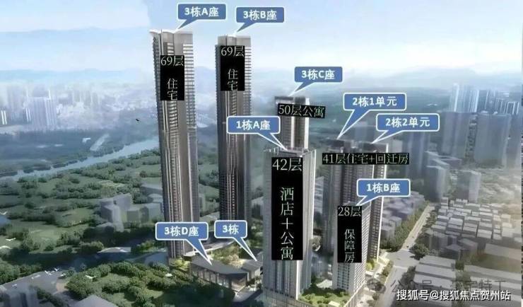 总栋数:8栋(1A栋42层酒店+公寓、1B栋28层保障房,2栋1/2单元41层住宅,3A/3B栋69层住宅;3C栋50层公寓、3D栋4层公寓)