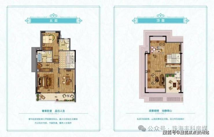 一线伶仃洋海景,将园林风景藏入家中,上叠位置最高,私密性相对较高,共3层空间,4楼可打造成公共休闲区;5楼则是纯粹休息区;顶层分为阁楼和露台