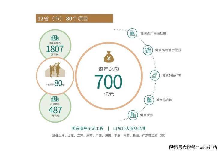 旗下健康置业进驻上海、山东、广东、海南、新疆等12省(市),开发项目80个,荣获中国品牌房地产100强,省属国有企业中最大康养地产开发企业等荣誉资质。打造国家康居示范工程,国匠实力,值得托付。