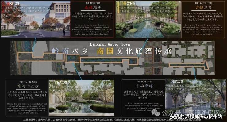 滨水街区中,从五桂雄峰、东海十六沙、古镇水乡到中山新港,超6000年中山及岭南文化的传承,营造四大水系风景,为水街提供舒适怡情的滨水赏景及丰富多元的南国人文体验。这就像是打开一个历史卷轴,从西侧到东侧,看到中山历史到现代的演变过程,亦见证了中山不断向东发展,向湾区融合的美好图景。